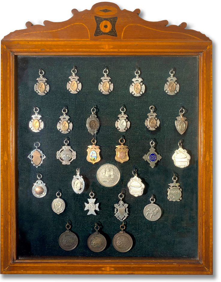 Admire these cherished honours elegantly showcased within an antique wooden cabinet, adding a touch of historic grandeur to any collection.